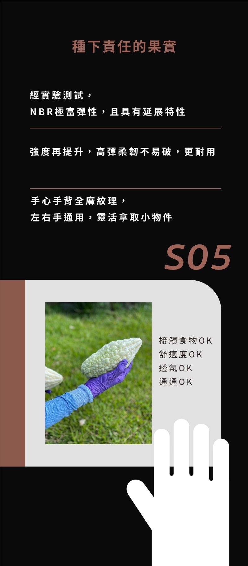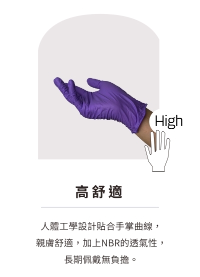 透氣性比天然橡膠手套優越,長時間穿戴時,手部較不易出汗
